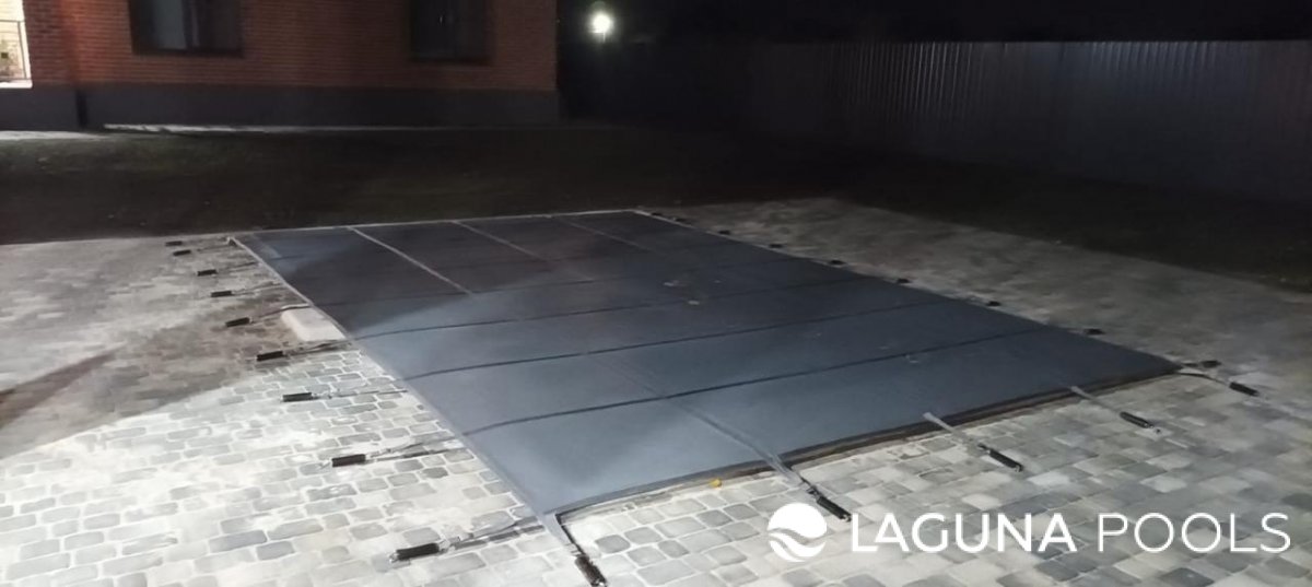 Прямоугольный бассейн накрыт темно-серым тентом, закрепленным натяжными ремнями на мощеной площадке.